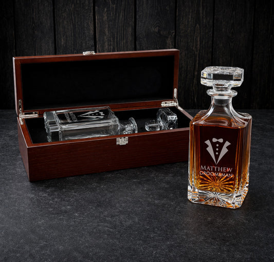 Tux Groomsman Best Man Personalized Whiskey Decanter Set