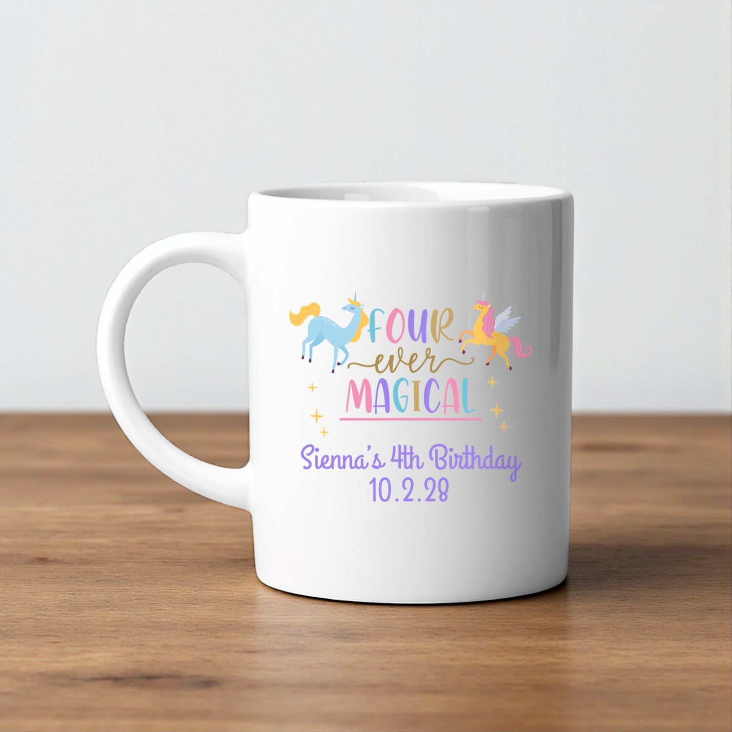 Make your child’s fourth birthday extra magical with the Four-Ever Magical Unicorn Personalized White Ceramic Coffee Mug. Designed for little unicorn lovers, this whimsical mug can be customized to create a one-of-a-kind party favor.