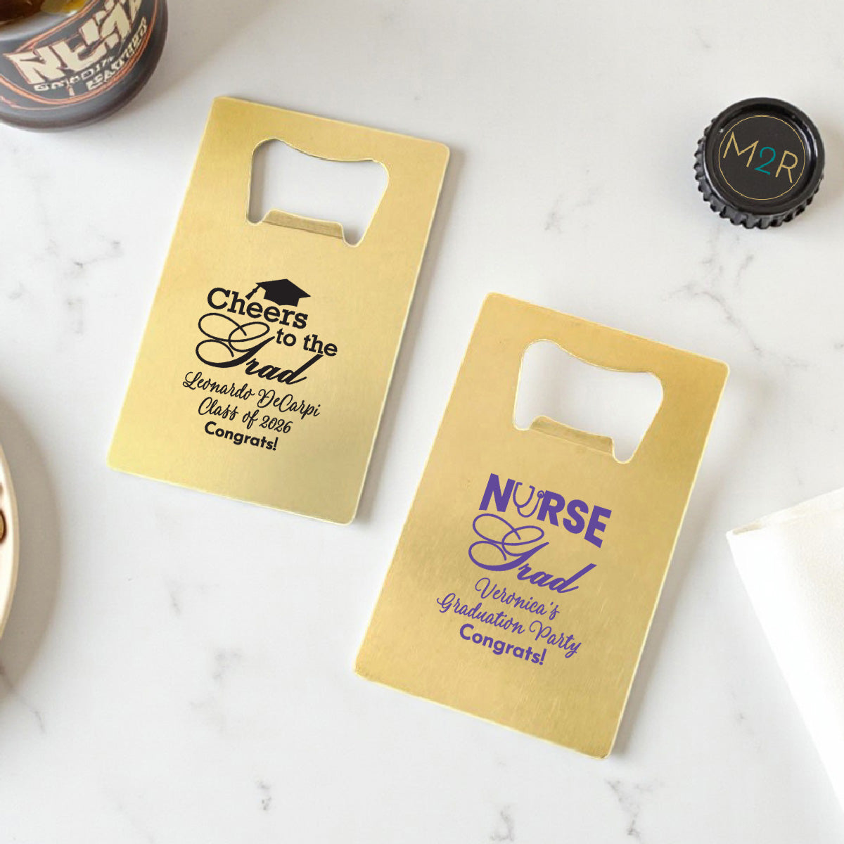 Celebrate academic success with the Graduation Personalized Gold Credit Card Bottle Opener. Sleek and practical, it can be customized with names, class year, or a congratulatory message. A perfect keepsake for graduates and guests alike.