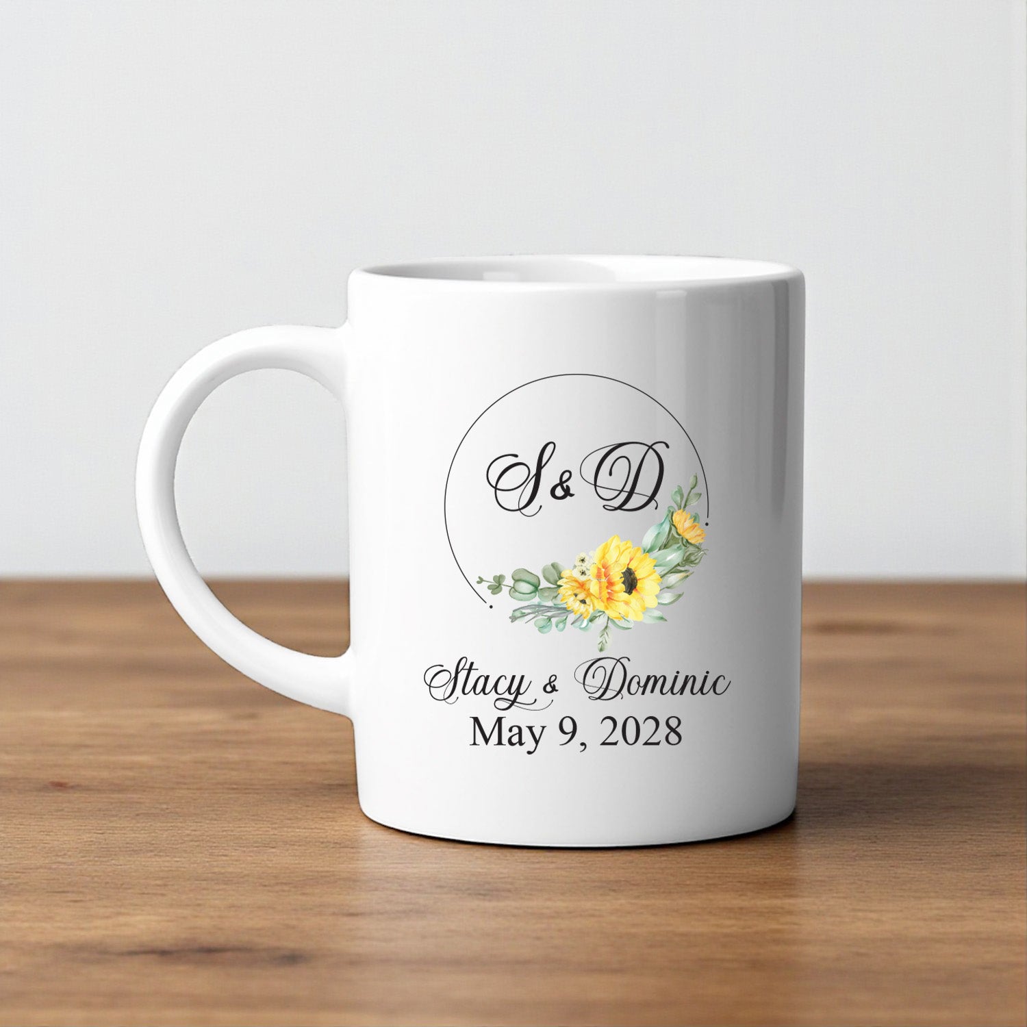 Add a touch of sunshine to weddings, anniversaries, or baby showers with the Sunflower Personalized White Ceramic Coffee Mug. Customizable with names, dates, or a short message, this cheerful mug makes a bright and practical favor for guests.